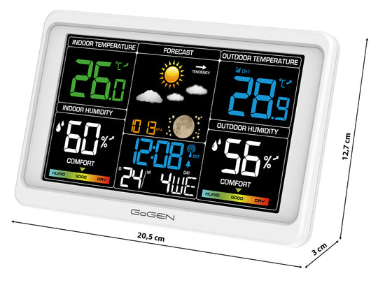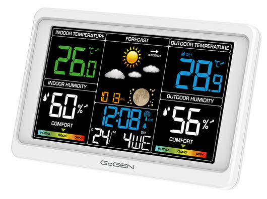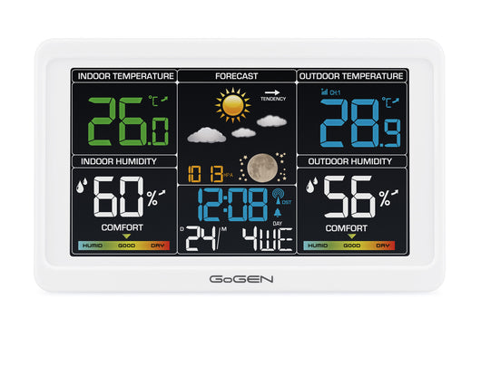 A GoGEN ME 3350 időjárás-állomással gyors és pontos áttekintést kap az időjárásról és a hőmérsékletről. Ez az elegáns, fehér modell mindent kínál, amit egy otthoni meteorológiai állomástól elvárhat: hőmérséklet- és páratartalom-mérés, légnyomás, animált időjárás-előrejelzés, valamint praktikus funkciók, mint az ébresztő és a naptár. Az akár három külső érzékelő csatlakoztatásának lehetőségével könnyedén nyomon követheti az időjárási körülményeket nemcsak a lakásban, hanem több kültéri helyszínen is.